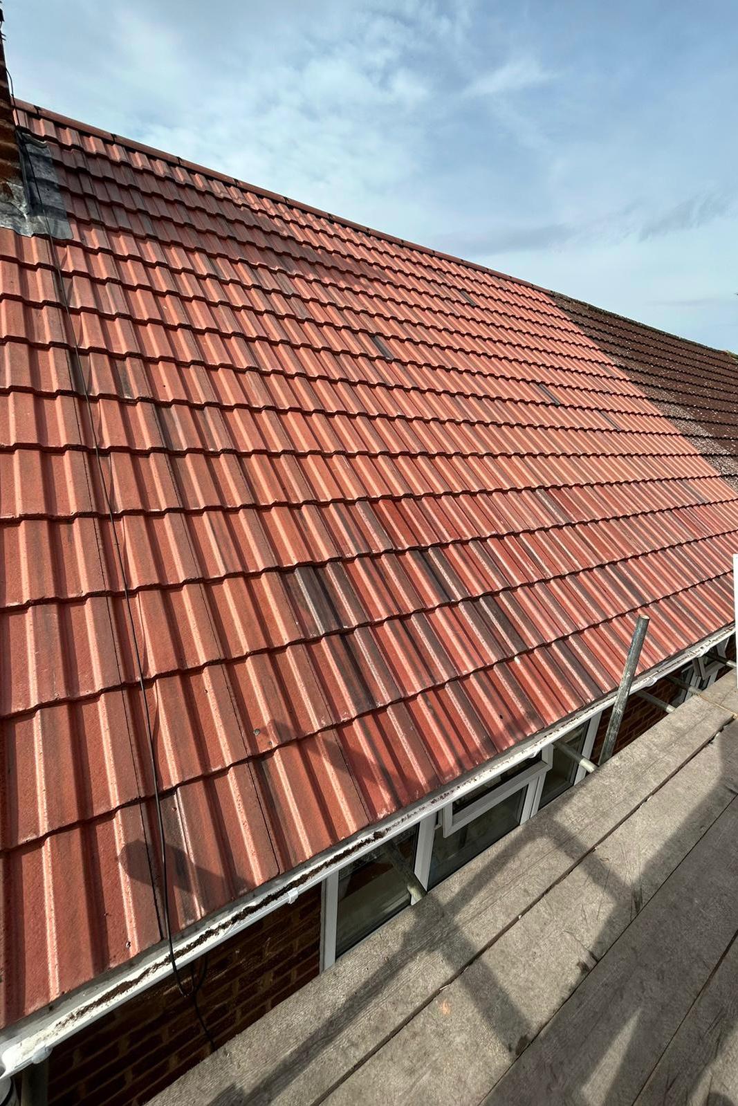 Tile Replacement: We replaced the moss-covered, porous concrete tiles with new “Redland” profile tiles in an Anthracite Grey finish to modernize the look of the home.